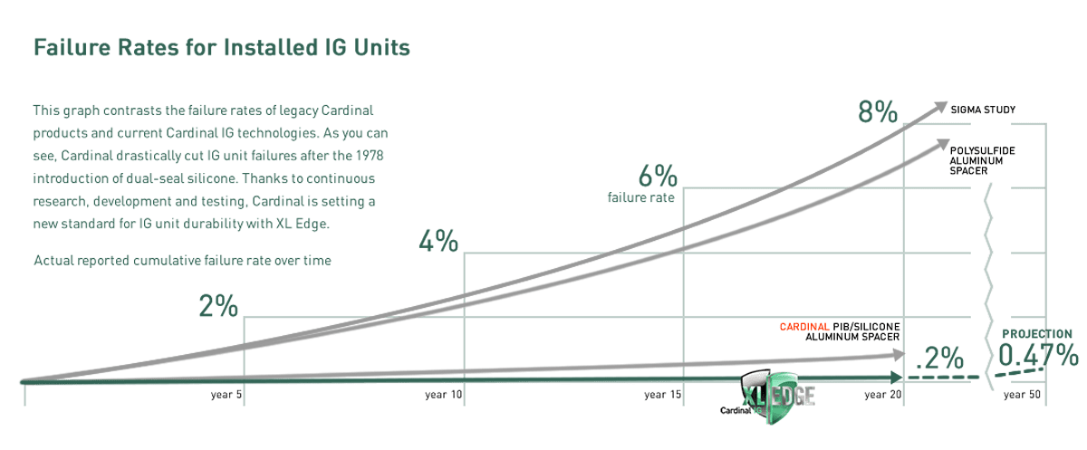 Cardinal's superior IG construction translates into a 0.2% seal failure rate over twenty years - plainly the lowest in the industry. To compare, the well-established 1976 Sealed Insulating Glass Manufacturing Association (SIGMA) study identifies average industry IG failures of over 9% in fifteen years. Modern competitive spacer systems simply cannot match the long-term durability characteristics of XL Edge IG. Even older Cardinal technologies, like IG with aluminum spacers and polysulfide or PIB, didn't stack up against XL Edge.