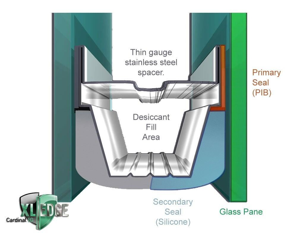 Cardinal provides a 20-year guarantee on XL Edge units because of their advanced design and fabrication. XL Edge is at the leading edge, incorporating a stainless steel spacer with airtight bent corners and a dual-seal construction of compressed polyisobutylene (PIB) and silicone. Desiccants are contained in the spacer to eliminate any potential for moisture. Argon is filled inside the IG unit, improving window U-factor. Since XL Edge is a warm-edge IG, the possibility of indoor condensation is greatly reduced.