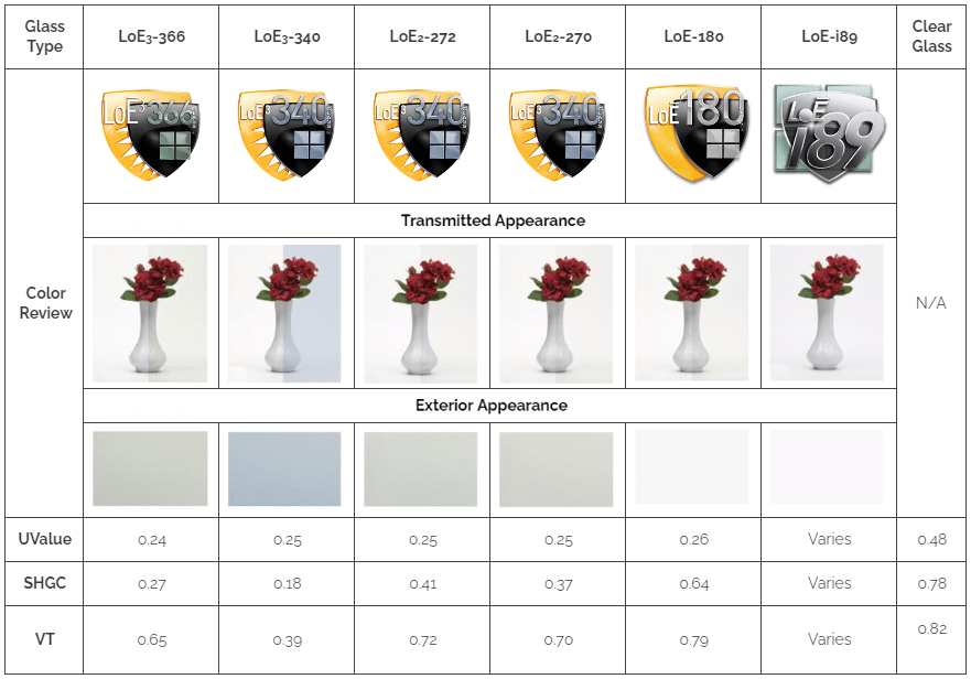 | Glass Type | LoE3-366 | LoE3-340 | LoE2-272 | LoE2-270 | LoE-180 | LoE-i89 | Clear Glass |