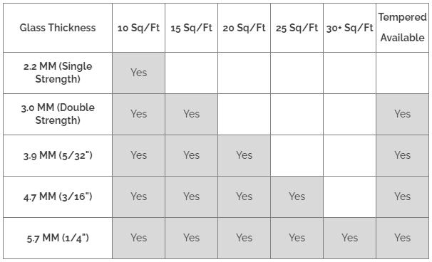 | Glass Thickness | 10 Sq/Ft | 15 Sq/Ft | 20 Sq/Ft | 25 Sq/Ft | 30+ Sq/Ft | Tempered Available |